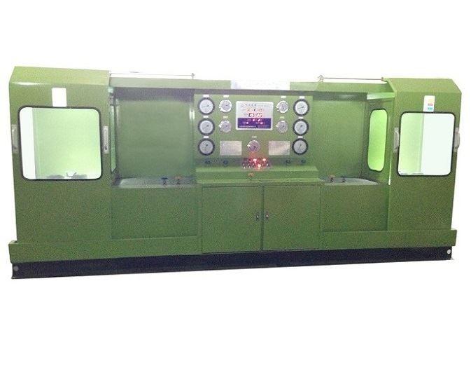 本機由液壓系統(tǒng)、機械部件,電器控制及多極氣源升壓裝置系統(tǒng)等部件組成。液壓系統(tǒng)是本試驗臺的動力主源。用于各類液壓缸和機械件驅(qū)動執(zhí)行功能。試驗面夾爪由液壓缸直接驅(qū)動執(zhí)行,軸向夾緊壓力是按閥門試驗壓力等級不同進行調(diào)節(jié)增壓(最高液壓增壓壓力31 5MPa)。各夾爪受力均,夾緊可靠。徑向移動由液壓缸傳動執(zhí)行,各夾爪進退同步,靈活自如,確保通徑大小不同閥門的測試。多極氣源升壓裝置是利用液氣聯(lián)動增壓。增壓范圍0.6—32 0MPa,用于閥門介質(zhì)壓力試驗。氣源升壓工作設(shè)有自動和手控二種操作選擇,當選用自動升壓工作時,工作人員可以近距離離開操縱臺觀察現(xiàn)場試驗情況。